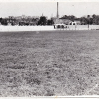 - Fotografia em preto e branco de um campo de futebol vazio, com grama ocupando a maior parte da imagem. Ao fundo, há um muro branco que separa o campo de uma área com árvores, casas e algumas construções. No horizonte, vê-se também uma chaminé e postes de eletricidade. No verso da fotografia contém escrito em manuscrito a caneta "O Estádio 'André Mulaski' no dia de sua inauguração em 5-7-1953 com o jogo Olinda 3 x Caramuru 1"