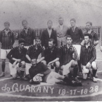 - Fotografia em preto e branco de um time masculino posando para a câmera em um campo de futebol. Há duas fileiras de pessoas. Na fileira de trás, oito homens estão de pé, quatro deles vestindo uniformes listradas com calções claros. Nas extremidades, há dois homens de terno e chapéu, um à esquerda e outro à direita, e dois homens de terno no centro. Na fileira da frente, cinco jogadores estão agachados, também com uniformes listrados. No centro da frente, um jogador está deitado segurando uma bola com as iniciais "G.S.C." escritas. Na parte inferior da imagem, há uma inscrição com a legenda: "2º do GUARANY 19-11-1928".