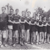 - Fotografia em preto e branco de um grupo de dez jogadores de futebol masculino, dispostos em linha, um atrás do outro, com as mãos apoiadas nos ombros do jogador à frente. O jogador à frente está posicionado com uma bola de futebol entre seus pés. Todos usam uniformes com camisetas listradas, shorts e meias longas. O cenário ao fundo inclui árvores altas, com palmeiras e outras plantas. A imagem foi tirada em um campo de futebol.