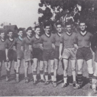 - Fotografia em preto e branco de um time de futebol masculino formado por 11 jogadores, alinhados em pé, posando para a foto. Todos estão uniformizados, vestindo camisetas escuras, shorts e meias, com exceção do último jogador à direita, que veste um uniforme diferente, com camisa preta de mangas longas. Ao fundo, é possível ver árvores e algumas construções distantes.